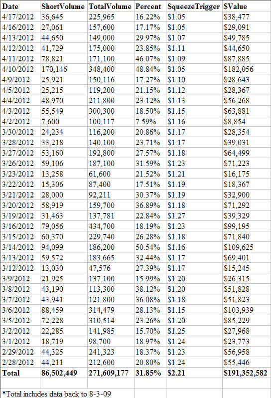 SqueezeTrigger -- 33 billion cell database tracks EVERY short sale (not just total short interest) in all US stocks and calculates volume weighted price that a short squeeze will begin in each stock.