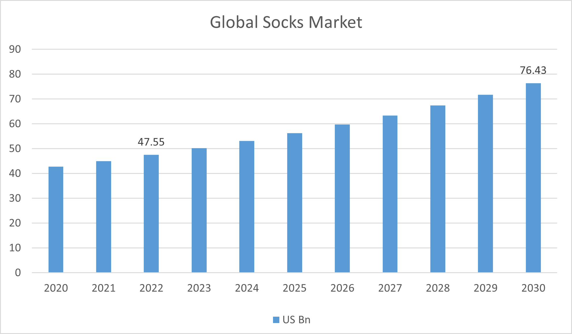 Global Socks Market accounted for US$ 42.75 billion in 2020 and is estimated to be US$ 76.96 billion by 2030 and is anticipated to register a CAGR of 6.1%. - By PMI