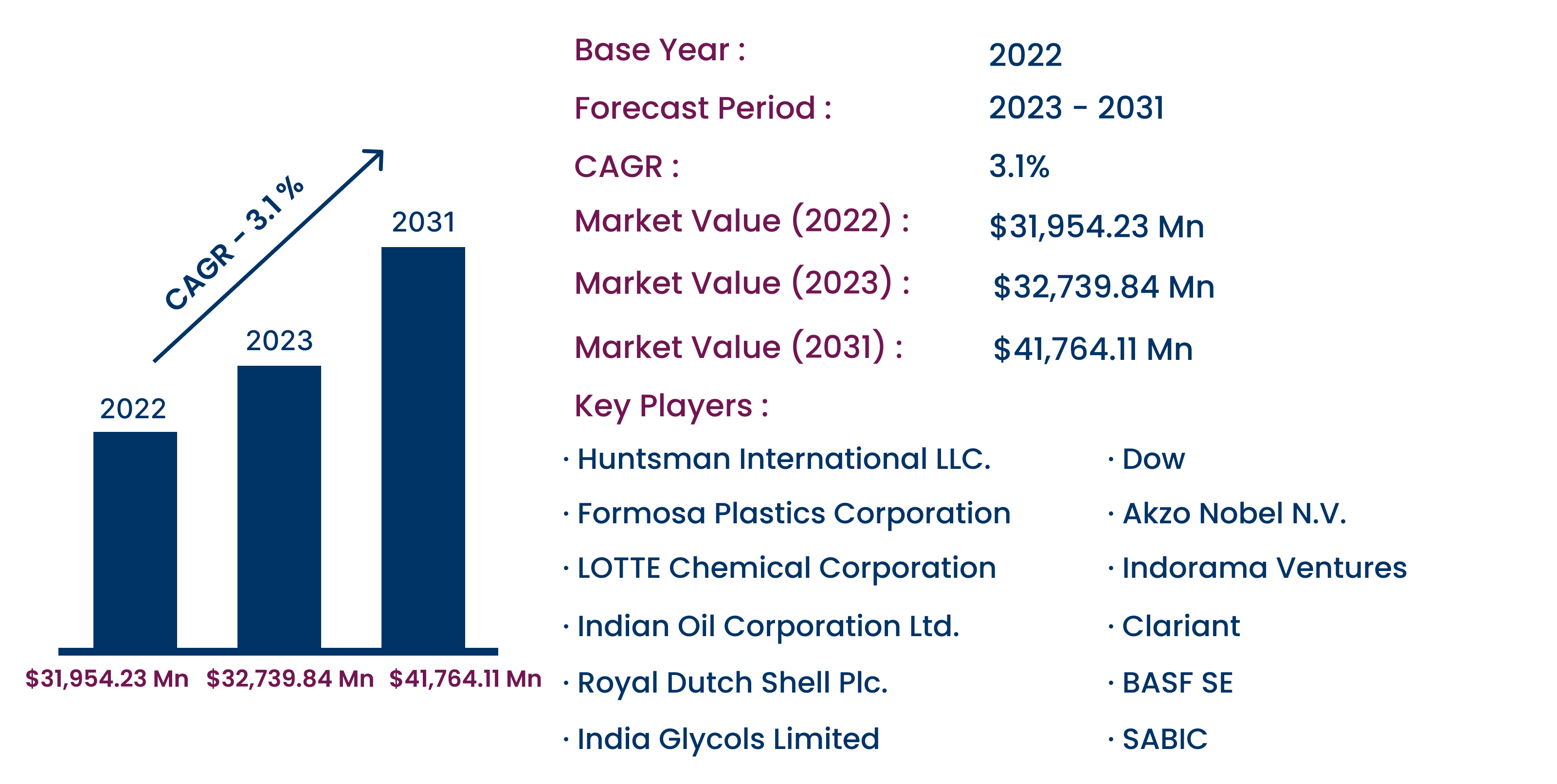 | Key Players | Huntsman International LLC., DowDuPont Inc., India Glycols Limited, Akzo Nobel N.V., Royal Dutch Shell Plc., Formosa Plastics Corporation, BASF SE, Indian Oil Corporation Ltd., LOTTE Chemical Corporation, SABIC, Indorama Ventures, and Clariant |
