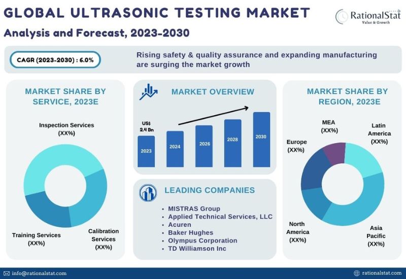 Wilmington, Delaware, Oct. 31, 2023 (GLOBE NEWSWIRE) -- Global Ultrasonic Testing Market is valued at US$ 2.4 billion in 2023 and is expected to grow at a significant CAGR of over 6.0% over the forecast period of 2023-2030, according to the published market report by RationalStat