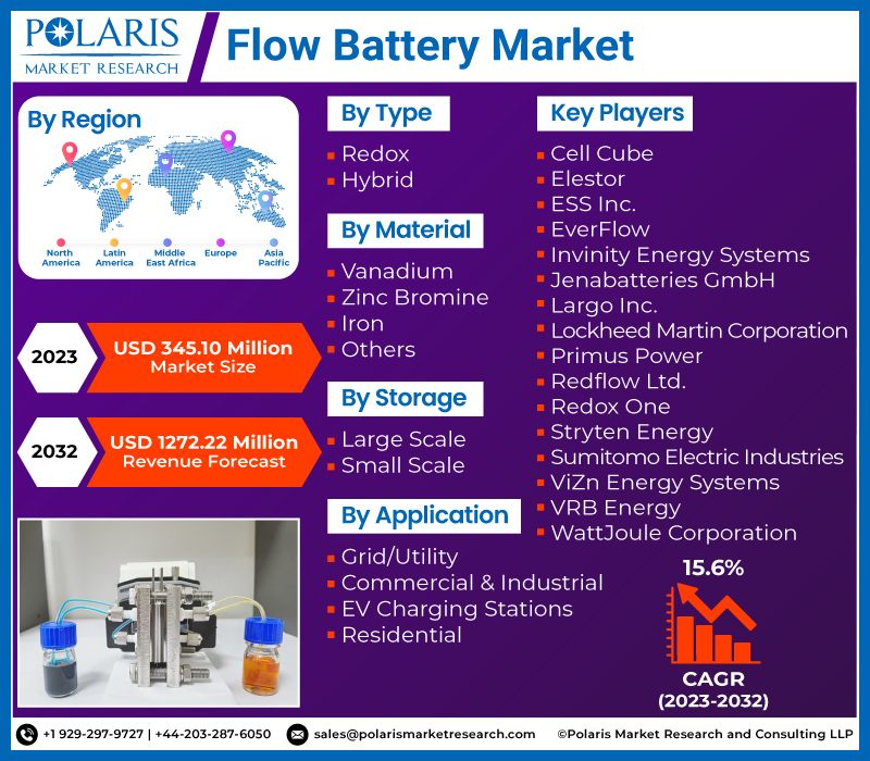 Browse the Detail Report “Flow Battery Market Share, Size, Trends, Industry Analysis Report, By Type (Redox, Hybrid), By Material (Vanadium, Zink Bromine, Iron, Others), By Application (Commercial & Industrial, EV Charging Stations, Residential), By Storage (Large, Small), By Region, And Segment Forecasts, 2023 - 2032” with in-depth TOC at: https://www.polarismarketresearch.com/industry-analysis/flow-battery-market