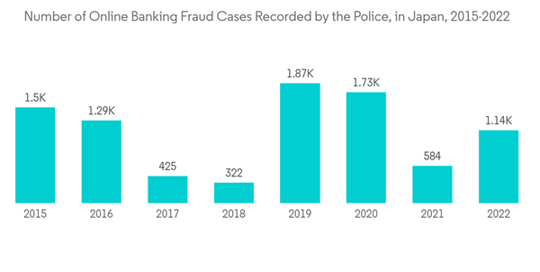 - Moreover, banks witnessed a sharp rise in internal and external fraud cases from the COVID-19 outbreak. The COVID-19 outbreak rescue package increased fraud, false claims, and other scams. Many of the systems that financial institutions and government agencies in place needed to verify the identity and claims of applicants adequately. For instance, according to National Police Agency Japan, the police in Japan recorded 1,136 online banking fraud cases in 2022, which constituted a substantial increase compared to the previous year.
