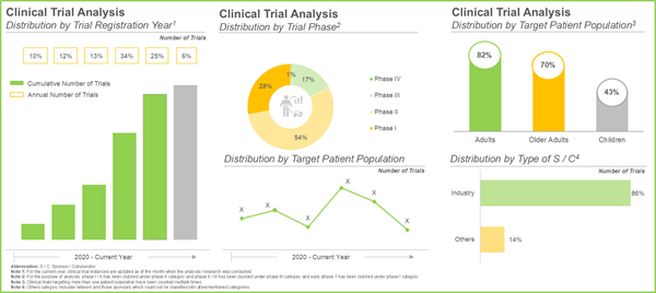 - Majority (65%) of the trials were registered in the last three years; a significant proportion of these trials are currently under early stages of research (phase I and phase II).