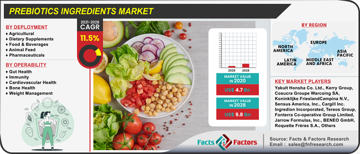 Browse the full “Prebiotics Ingredients Market – By Deployment (Agricultural, Dietary Supplements, Food & Beverages, Animal Feed, and Pharmaceuticals) and By Operability (Gut Health, Immunity, Cardiovascular Health, Bone Health, and Weight Management): Global Industry Outlook, Market Size, Business Intelligence, Consumer Preferences, Statistical Surveys, Comprehensive Analysis, Historical Developments, Current Trends, and Forecast 2021–2028” Report at https://www.fnfresearch.com/prebiotics-ingredients-market