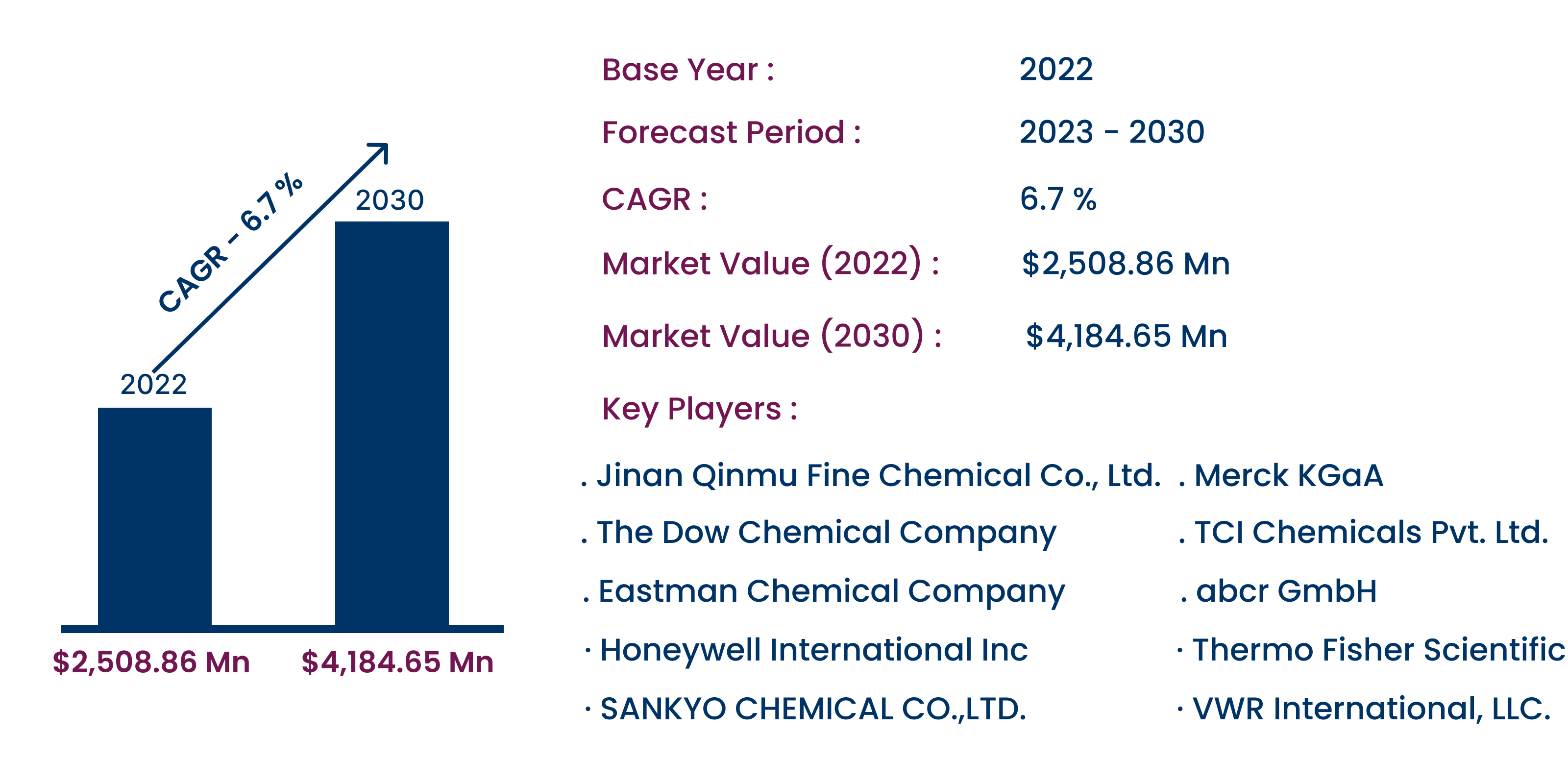 | Key Players | Merck KGaA, Eastman Chemical Company, TCI Chemicals Pvt. Ltd., SANKYO CHEMICAL CO.,LTD., Honeywell International Inc, The Dow Chemical Company, abcr GmbH, Thermo Fisher Scientific, VWR International, LLC., Jinan Qinmu Fine Chemical Co., Ltd. |