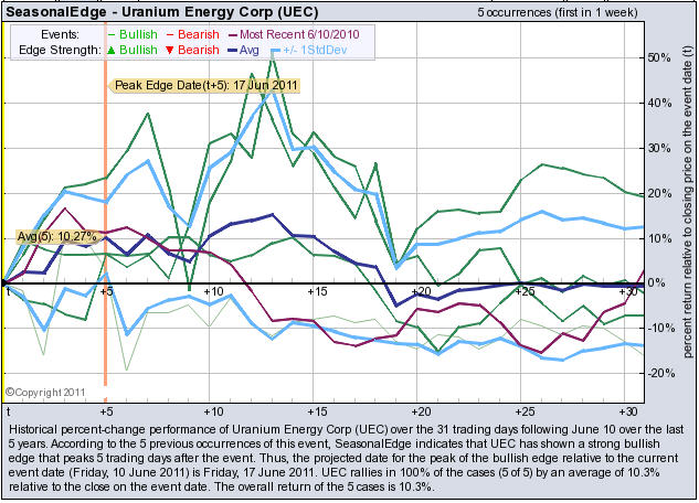 According to seasonality trends, in 5 of the past 5 years UEC has risen an average of 10.3% between June 9th and June 17th.