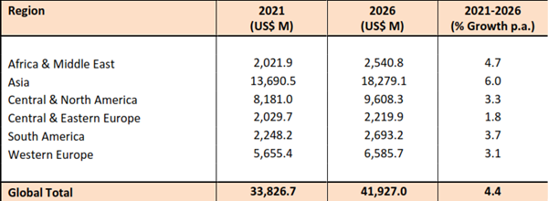 - Total Global Consumption of Flavours & Fragrances by Region, 2021-2026 (US$ Millions)