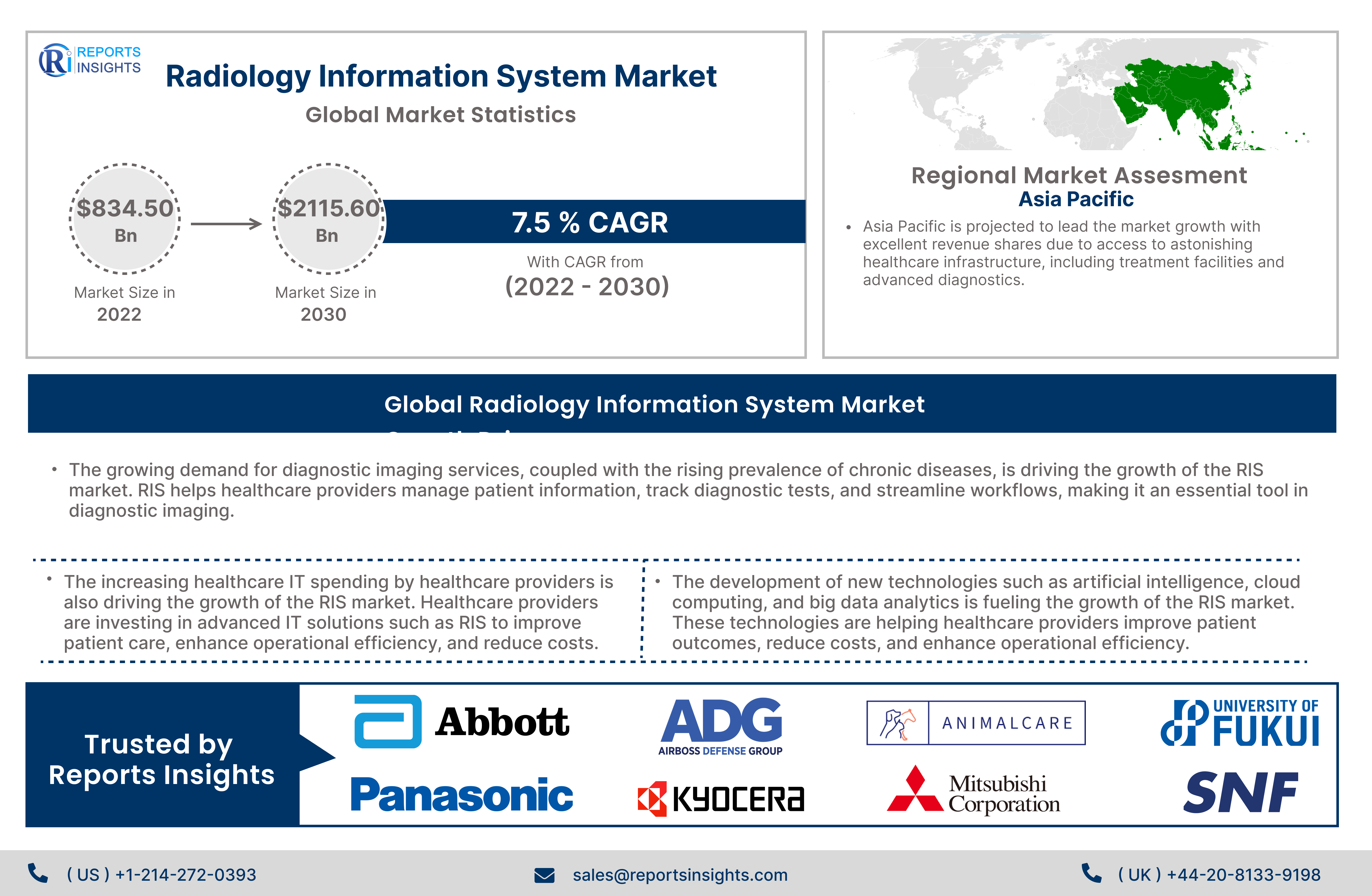 New York, April 04, 2023 (GLOBE NEWSWIRE) -- According to the updated research report titled Global Radiology Information System Market published by Reports Insights, the global radiology information system market was valued at USD 834.50 Million in 2022, and it is projected to grow at a Compound Annual Growth Rate (CAGR) of 7.5%, reaching USD 2,115.60 Million by the year 2030. This estimation is based on a comprehensive analysis of the market's historical and current trends, industry dynamics, and macroeconomic factors that are expected to impact the market's growth during the forecast period.