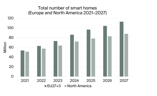 The strong market growth is expected to continue in the next five years. By 2027, the analyst estimates that about 88.1 million homes in North America will be smart, equal to 58 percent of all homes in the region. The European market is still somewhat behind the North American, in terms of market penetration. There was a total of 63.1 million smart homes in Europe at the end of 2022. The number of smart homes in the region is forecasted to reach about 112.8 million at the end of 2027, representing a market penetration of close to 47 percent.