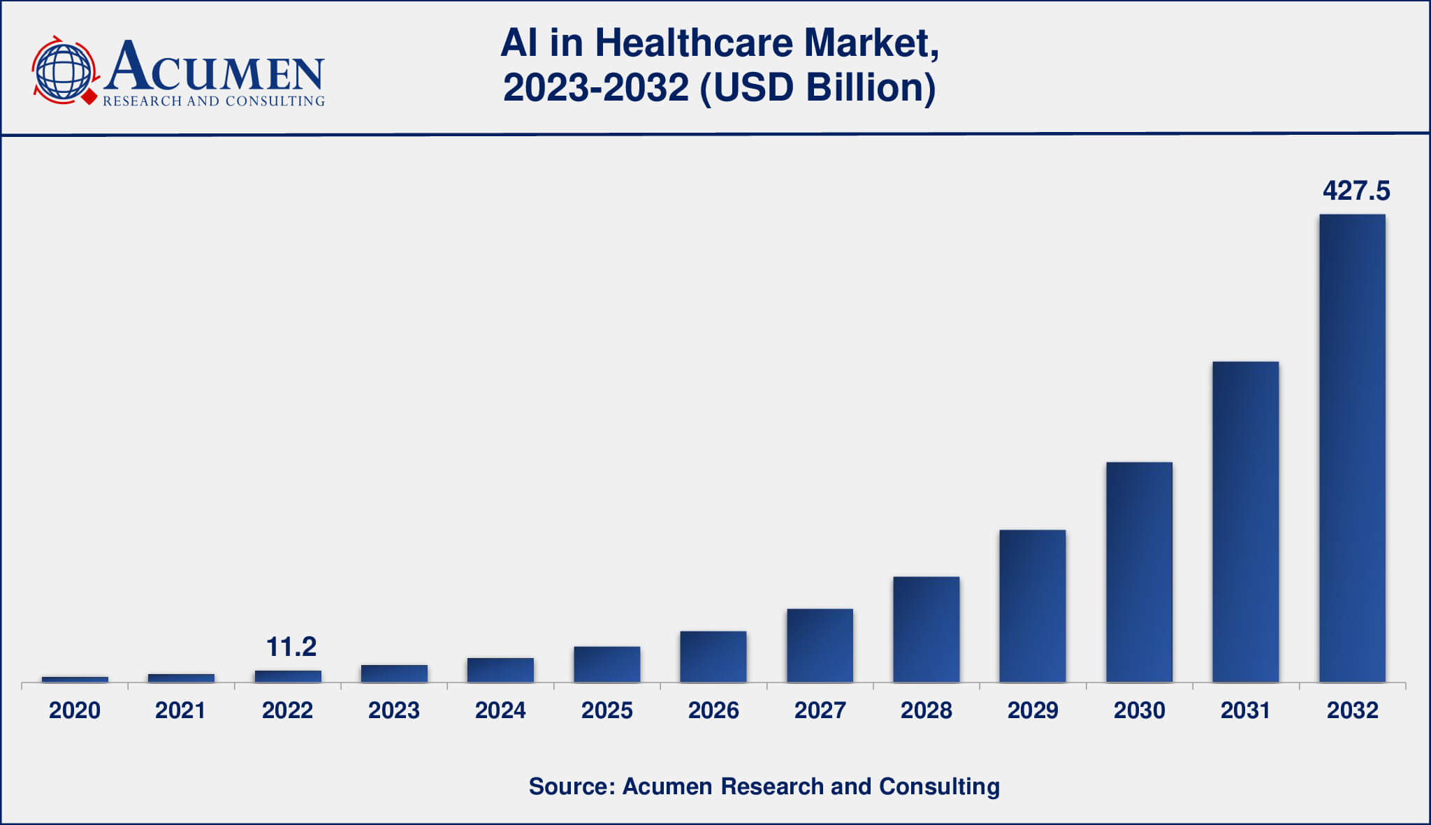 - The Global AI in Healthcare Market size was valued at USD 11.2 Billion in 2022 and is projected to reach USD 427.5 Billion by 2032.