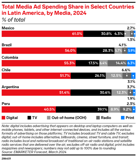 - Total Media Ad Spending Share in Select Countries in Latin America, by Media, 2024 (% of total)