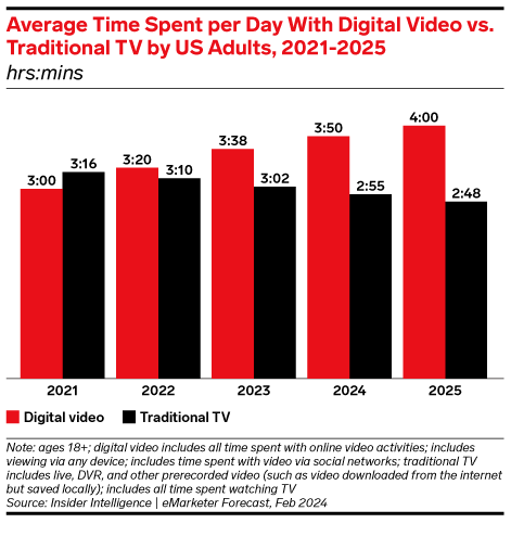 - Average Time Spent per Day With Digital Video vs. Traditional TV by US Adults, 2021-2025