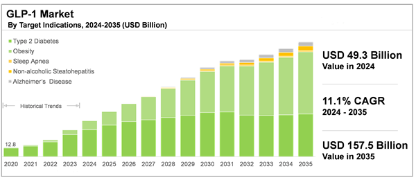 Over the past few years, a number of GLP-1 drugs targeting obesity and type 2 diabetes have received regulatory approvals globally. In 2024, the FDA approved Wegovy, developed by Novo Nordisk, for the treatment of serious heart problems in adults with obesity or overweight. Given the lucrative potential of these drugs, the GLP-1 market, also known as GLP-1 receptor agonist market, has gained significant attention of both private and public investors leading to the substantial market growth during the forecast period.
