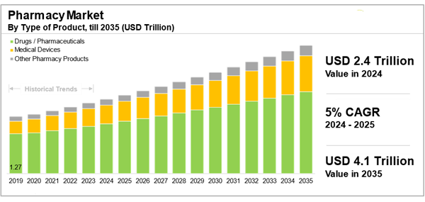 The Pharmacy Market is valued at USD 2.4 trillion in 2024 growing at a CAGR of 5% during the forecast period 2024-2035.