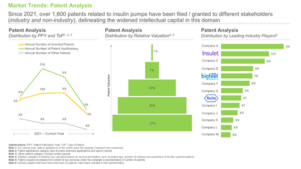 - An in-depth analysis of patents that have been filed / granted in insulin pump domain, since 2021, based on several relevant parameters, such as the type of patent, patent publication year, patent application year, patent jurisdiction, Cooperative Patent Classification (CPC) symbols, type of applicant, and most active industry and non-industry players. In addition, it includes patent benchmarking and an insightful patent valuation analysis, highlighting the leading players.