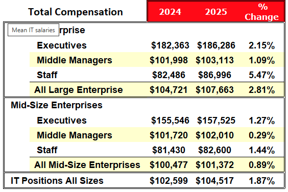 - Median compensation (including bonuses and fringe benefits) for IT Pros in large enterprises is $107,663 with executives' median of $186,286.