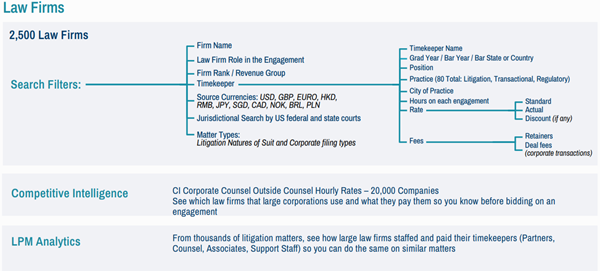 - Enhanced Competitive Advantage: With detailed comparisons across firms, practice areas, and regions, you can ensure that your pricing remains both competitive and aligned with market trends. Unique insights into corporate client spending habits help you tailor your services to meet client expectations and win more business.