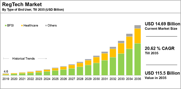 The global regtech market size is estimated to grow from USD 14.69 billion in 2025, to USD 115.5 billion by 2035, at a CAGR of 20.62% during the forecast period, till 2035.
