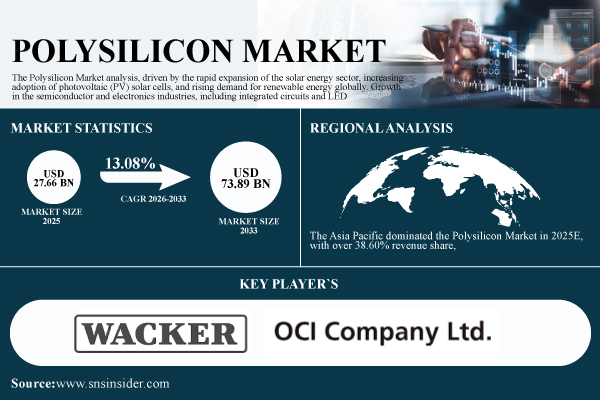 Austin, Dec. 04, 2025 (GLOBE NEWSWIRE) -- According to SNS Insider, The Polysilicon Market Size is estimated at USD 27.66 Billion in 2025 and is expected to reach USD 73.89 Billion by 2033 and grow at a CAGR of 13.08% over the forecast period 2026-2033. The growing need for renewable energy worldwide, the quick growth of the solar energy industry, and the growing use of photovoltaic (PV) solar cells are the main factors driving the polysilicon market growth globally.