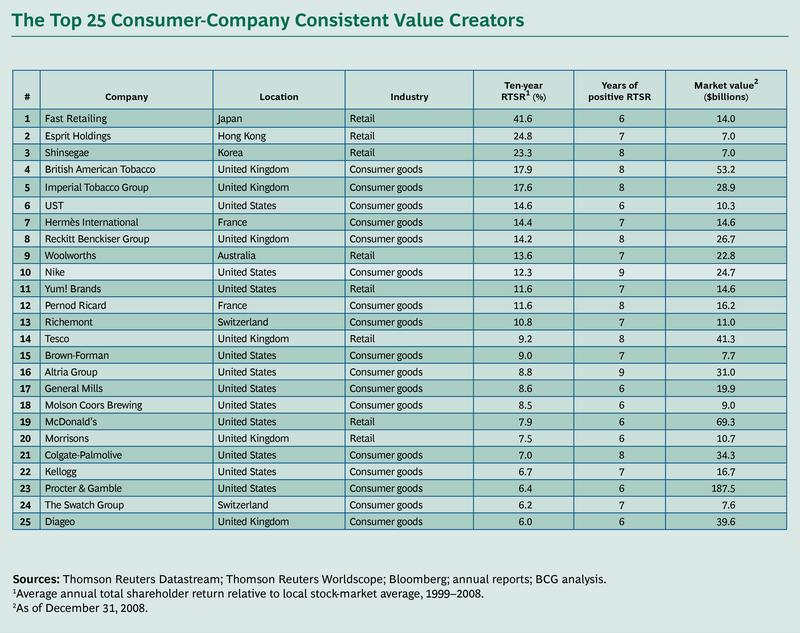 Fast Retailing, Esprit Holdings, Shinsegae, British American Tobacco, and Imperial Tobacco Group Are the First Five Global Companies in BCG's Top 25 "Consistent Value Creators in the Consumer Industry" Over the Past Ten Years