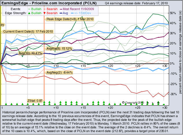 According to the 10 previous quarterly earnings reports, PCLN has shown a bullish edge that peaks 8 trading days after the report. PCLN rallies in 80% of the cases (8 of 10) by an average of +15.1% relative to the date of the earnings release. At the time this story was written, PCLN is +9.59% after earnings were released.
