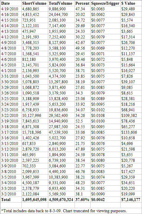 SqueezeTrigger -- 25 billion cell database tracks EVERY short sale (not just total short interest) in all U.S. stocks and calculates volume weighted price that a short squeeze will begin in each stock.