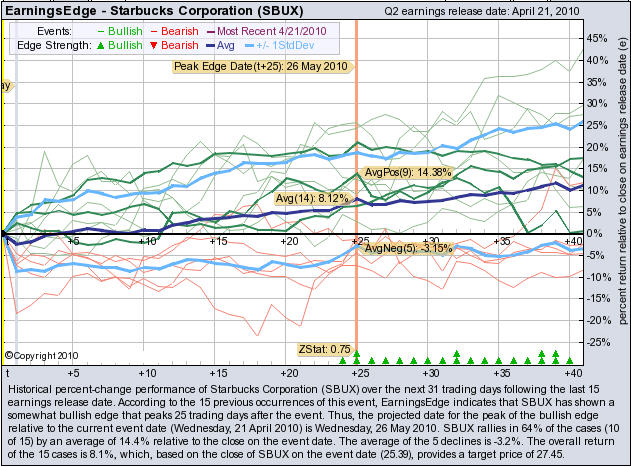 According to the 15 previous April earnings reports, (Nasdaq:SBUX) has shown a bullish edge that peaks 25 trading days after the report. SBUX rallies in 64% of the cases (10 of 15) by an average of +14.4% relative to the date of the earnings release. At the time this story was written, SBUX is +7.13% immediately after earnings were released.
