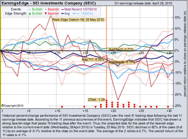 According to the 11 previous quarterly earnings reports, SEIC has shown a bearish edge that peaks 19 trading days after the report. SEIC drops in 82% of the cases (9 of 11) by an average of -5.1% relative to the date of the earnings release. At the time this story was written, SEIC is -5.67% immediately after earnings were released.