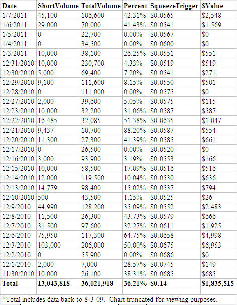 NEWPORT BEACH, Calif., Jan. 10, 2011 (GLOBE NEWSWIRE) -- BUYINS.NET, http://www.buyins.net , a leading provider of Regulation SHO compliance monitoring, short sale trading statistics and market integrity surveillance, has updated coverage on Axial Vector Engine (Pink Sheets:AXVC) after releasing the latest short sale data through January 7, 2011. The total aggregate number of shares shorted since August 2009 is approximately 13.04 million shares. 36.21% of daily volume is short selling. The SqueezeTrigger price for all (Pink Sheets:AXVC) shares shorted is $0.14. A short squeeze is expected to begin when shares of AXVC close above $0.14.