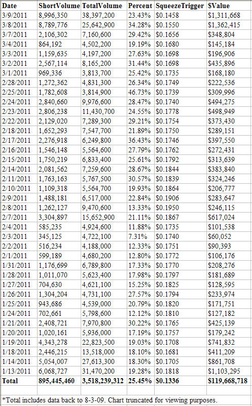 NEWPORT BEACH, Calif., March 14, 2011 (GLOBE NEWSWIRE) -- BUYINS.NET, http://www.buyins.net, a leading provider of Regulation SHO compliance monitoring, short sale trading statistics and market integrity surveillance, has updated coverage on Advanced Cell Technology (OTCBB:ACTC) after releasing the latest short sale data through March 9, 2011. The total aggregate number of shares shorted since August 2009 is approximately 895 million shares. Approximately 25.45% of daily volume is short selling. The SqueezeTrigger price for all (OTCBB:ACTC) shares shorted is $0.13. A short squeeze has already begun as ACTC is trading above its SqueezeTrigger Price.