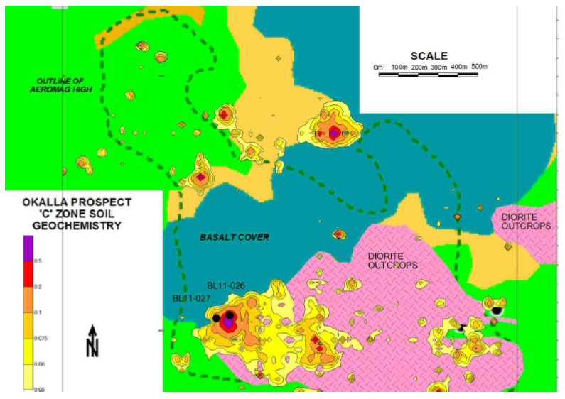 The geochemical anomaly terminates to the north against an overlying Quaternary flood basalt flow. An extension to the geochemical survey shows a further gold-copper soil anomaly about 1km to the northeast, beyond the basalt ridge. The accompanying map shows the location of these two holes in relation to the gold anomalies overlain on the simplified geology.