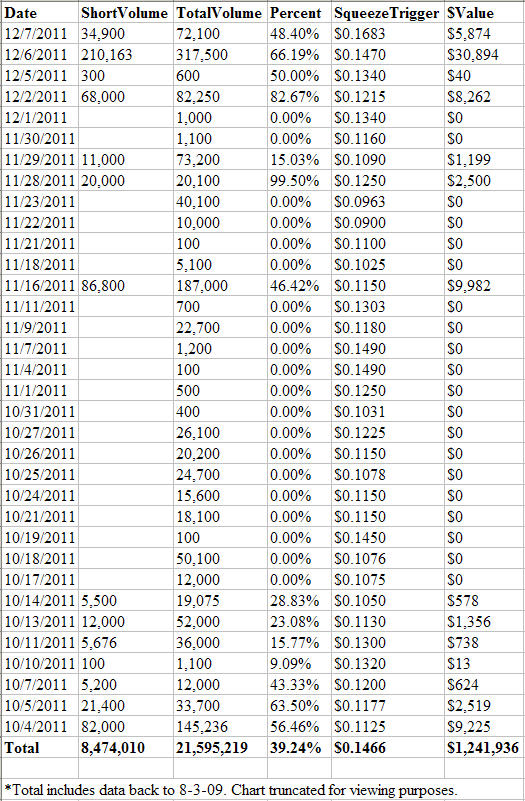 NEWPORT BEACH, Calif., Dec. 8, 2011 (GLOBE NEWSWIRE) -- BUYINS.NET, http://www.buyins.net, a leading provider of Regulation SHO compliance monitoring, short sale trading statistics and market integrity surveillance, has updated coverage on Power of the Dream Ventures (OTCBB:PWRV) after releasing the latest short sale data through December 7, 2011. The total aggregate number of shares shorted since August 2009 is approximately 8.47 million shares. Approximately 39.24% of daily trading volume is short selling. The SqueezeTrigger price for all PWRV (OTCBB:PWRV) shares shorted is $.146. A short squeeze has begun as the stock is above its $.146 SqueezeTrigger Price.