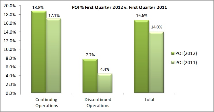 For the 2012 first quarter, property operating income (POI) from continuing operations rose $0.4 million, or 12.9 percent, compared to the year-ago period. The increase resulted from a combination of higher revenue and improved cost management, especially in the areas of utilities and repairs and maintenance. POI is calculated as revenue from room rentals and other hotel services less hotel and property operations expenses. See attached chart (Property Operating Income Percent First Quarter 2012 versus First Quarter 2011).
