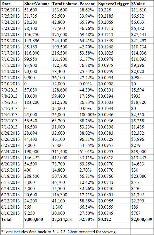On July 29, 2013, BUYINS.net -- a leading provider of Regulation SHO compliance monitoring, short sale trading statistics and market integrity surveillance -- updated coverage on Premier Holding Corp. after releasing the latest short sale data through July 26, 2013. The total aggregate number of shares shorted since May 2012 is approximately 9 million shares. Approximately 32.7 percent of daily trading volume is short selling. The Squeeze Trigger price for all PRHL shares shorted was $0.22 as of July 26. A short squeeze had just begun as PRHL crossed above its $0.22 Squeeze Trigger Price.