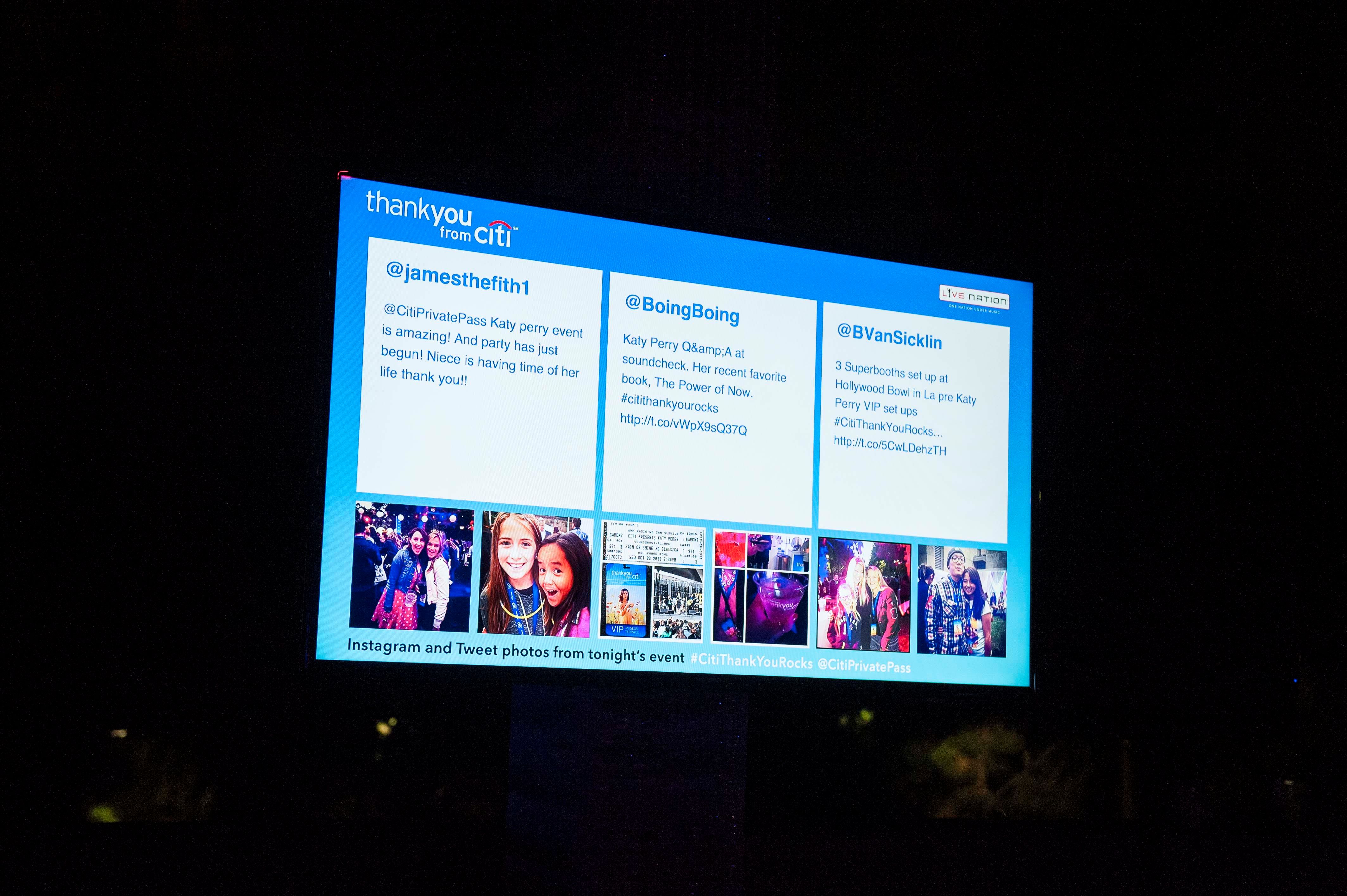 During the pre-show for Citi ThankYou cardmembers, Perry treated thousands of lucky fans to an intimate acoustic performance of her hit songs "Roar", "Unconditionally", and more. During the pre-show performance, Perry participated in a Q&A where Citi ThankYou cardmembers could ask Katy questions against the beautiful backdrop of the Hollywood Bowl.