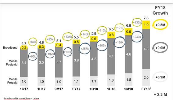 • The Group has increased its customer base by 2.3M, to close to 8M. 1.4M between fixed and mobile postpaid broadband.