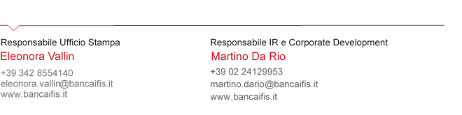 Il bilancio d’esercizio al 31 dicembre 2018 sarà sottoposto all’approvazione dell’Assemblea ordinaria prevista il prossimo 19 aprile. Per i dettagli si rimanda al comunicato stampa dei risultati preliminari disponibile nella sezione “Media Press” del sito ufficiale www.bancaifis.it.