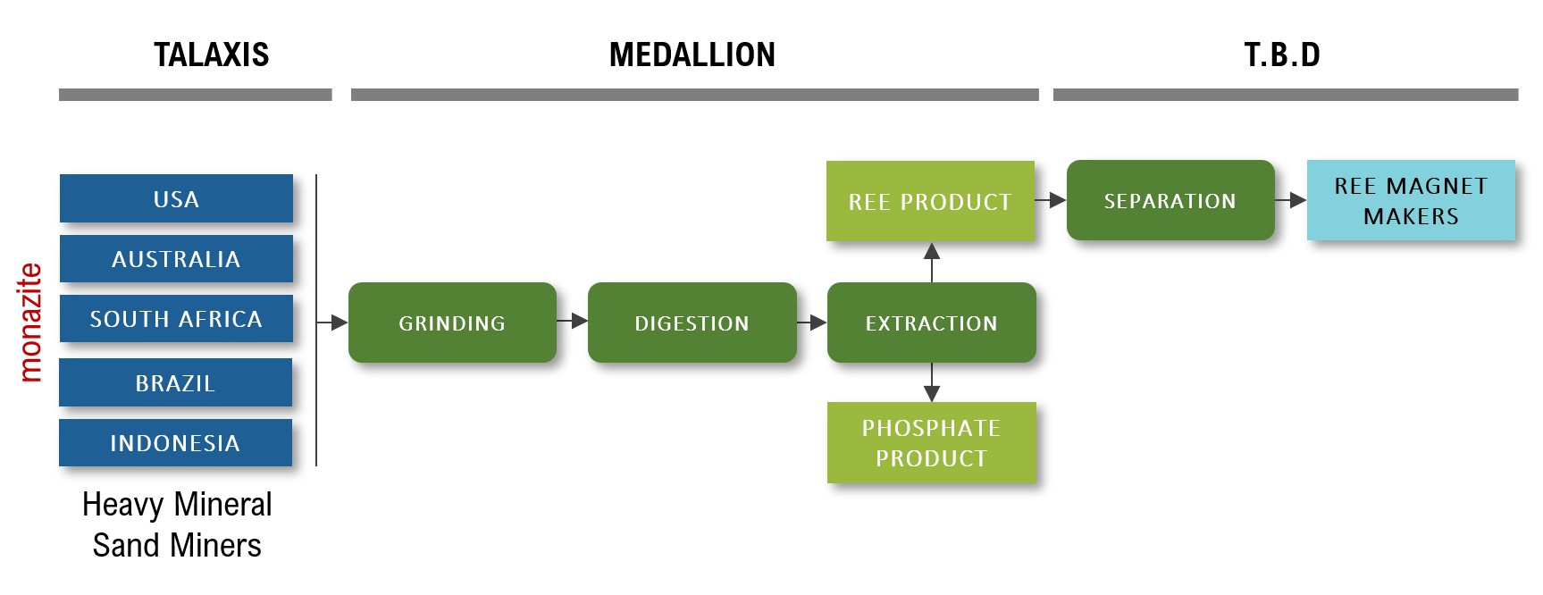 Nd, Pr, Dy and Tb are the essential feedstock for REE high strength permanent magnets, and together typically comprise greater than 85% of the value of REEs within monazite. A permanent pairing with a separation technology that is highly suitable for Medallion Resources’ monazite-extraction technology will provide customers with the confidence that market ready materials will be available in the shortest time frame with the lowest environmental footprint possible.