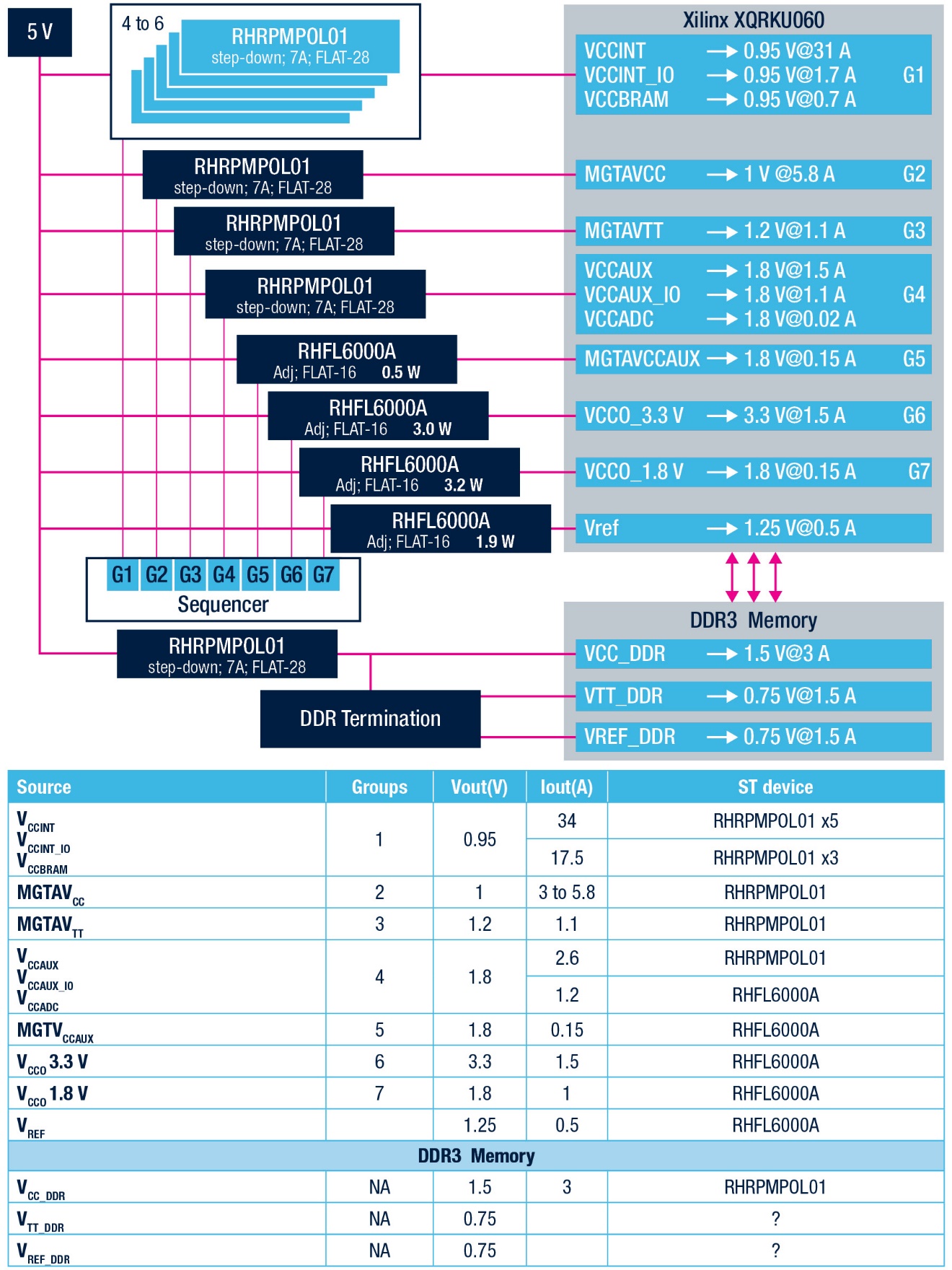 ST worked closely with Xilinx to design a power source that ensures reliable operation of the XQRKU060 by providing excellent fixed-point voltage accuracy as well as stability in the event of transients due to normal FPGA operation and radiation events. The solution uses ST’s RHRPMPOL01 rad-hard point of load 7A monolithic synchronous step-down regulator and RHFL6000A linear voltage regulator, all SEL immune and QML-V qualified. These devices meet the requirement for an input voltage up to 12V and output voltage down to 0.8V. Both exhibit high fixed-point accuracy with radiation performance that ensures high resistance to Total Ionizing Dose (TID) thereby minimizing any output-voltage drift.