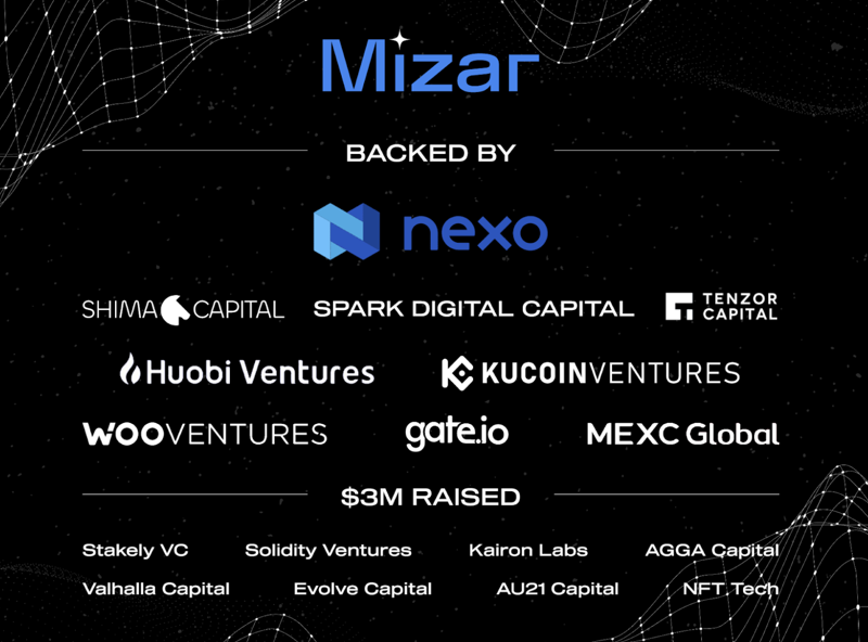 Warsaw, Poland, Feb. 25, 2022 (GLOBE NEWSWIRE) -- Mizar has announced the successful closing of their seed funding round, raising $3 million to build the next generation smart trading tools for everyone’s use. The financing for this round was led by Nexo, with participation from Huobi Ventures, KuCoin Ventures, Gate Labs, MEXC, WOO Ventures, Spark Digital Capital, Shima Capital, Stakely VC, Evolve Capital, Kairon Labs, AU21 Capital, Tenzor Capital, NFT Tech, David Post, and Dean Thomas.
