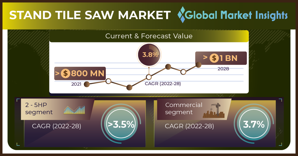 The stand tile saw market is expected to surpass USD 1 billion by 2028, as reported in a research study by Global Market Insights Inc. Rising demand from the residential sector will augment the market growth.