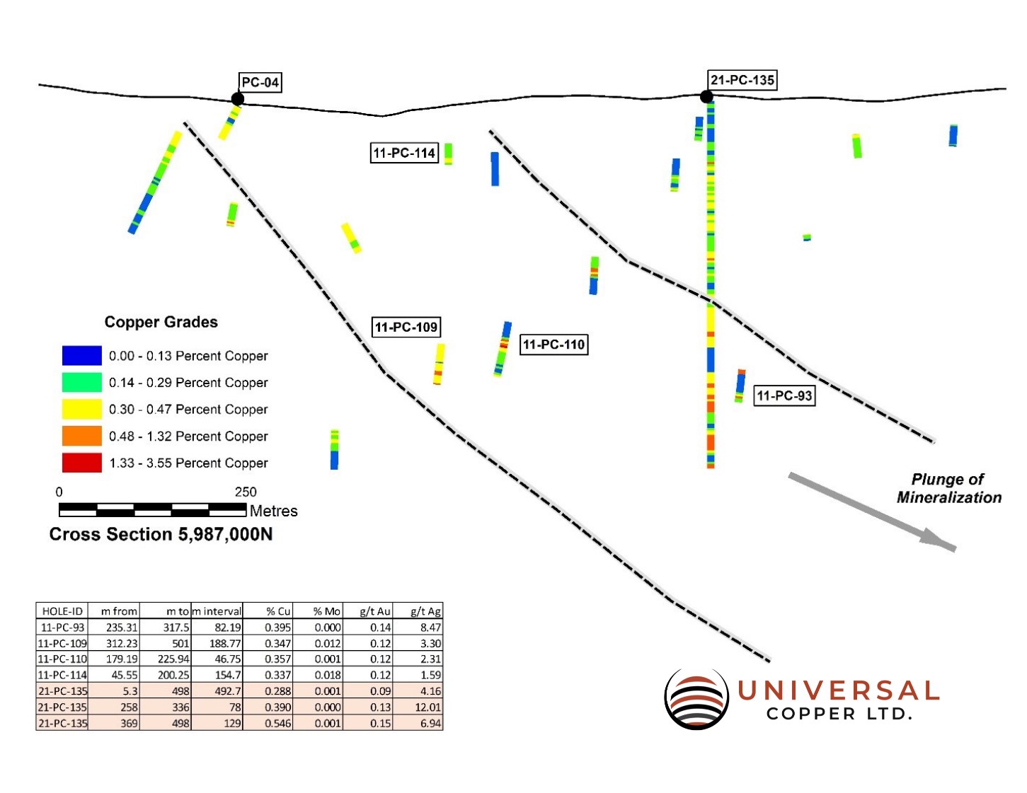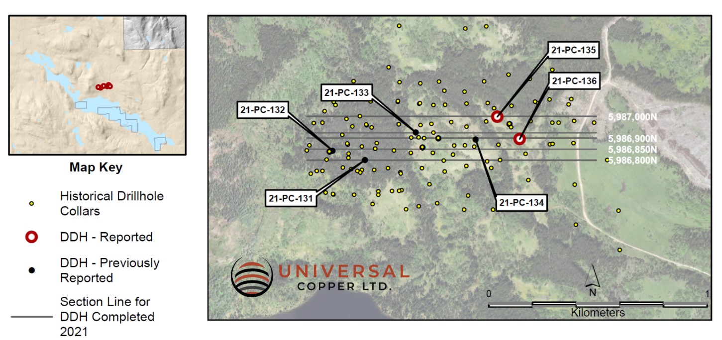 Clive Massey, Universal Copper’s CEO, stated: “An open-ended, high grade copper intercept in the bottom 129 metres of drill hole 135 supports our new interpretation that the system is tilted and that the high-grade zone plunges eastward. Today’s results, along with the recent robust copper grades released on January 18th, 2022, and January 25th, 2022, represent significant positive progress for the Poplar Project. Universal Copper is focused on leveraging our new exploration model and building the Poplar Project into a premier deposit in a metal endowed, road/rail accessible emerging exploration district in a top-tier jurisdiction”.
