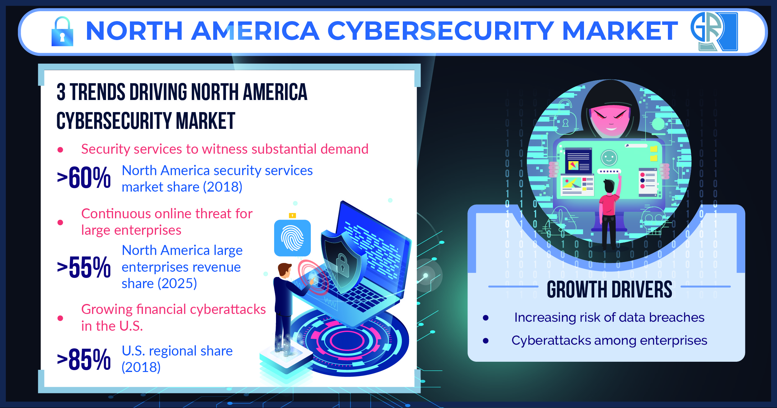 North America cybersecurity market size is expected to record substantial gains in the near future, with increasing risk of data breaches and cyberattacks among enterprises.