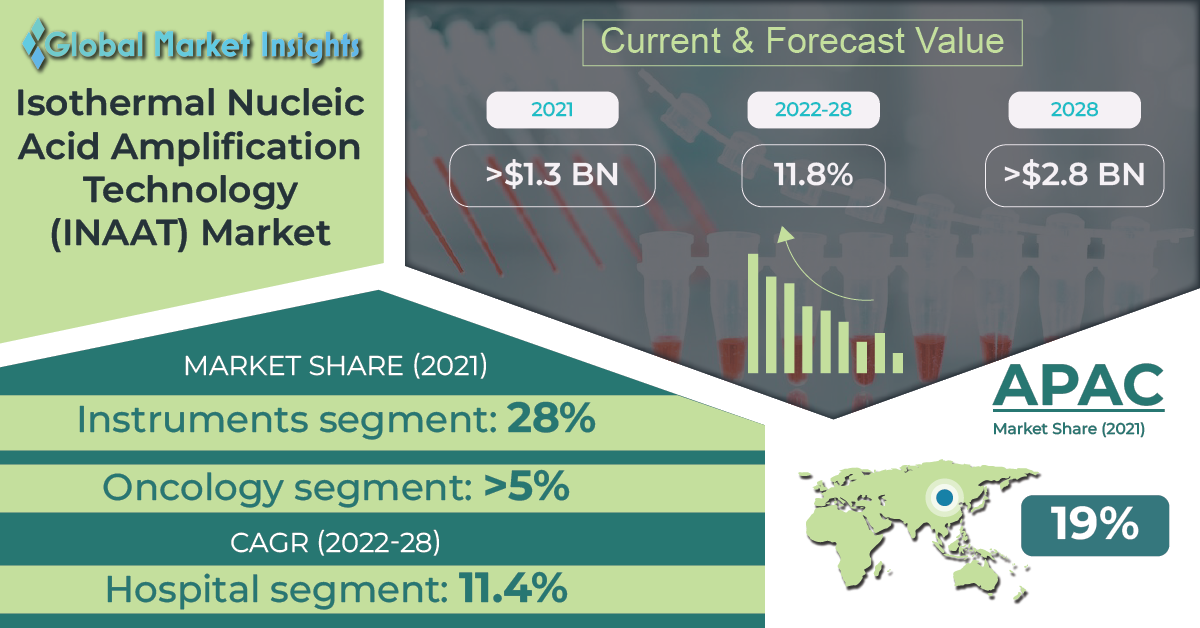 The isothermal nucleic acid amplification technology (INAAT) market value is projected to reach USD 2.8 billion by 2028, according to a new research report by Global Market Insights Inc. Increasing number of pathology labs and services equipped with advanced diagnostic systems will boost the industry expansion.