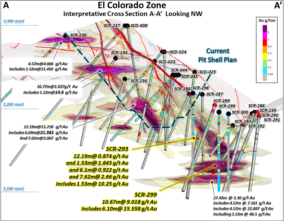 Two drill holeswere also completed outside of the resource pit shell used to calculate the zone’s gold resource in the updated Mineral Resource Estimate.Drill hole SCR-291 is approximately 100 meters southeast of the proposed pit shell where it intercepted 3.05 meters averaging 0.530 g/t Au, including 1.53 meters averaging 1.670 g/t Au. Drill hole SCR-293 is approximately 30 meters eastof the pit shell where it intercepted 12.19metersfrom surface averaging 0.874 g/t Au, including 1.52meters averaging 3.62 g/t Au.At a depth of 184.4 meters, the same drill hole intercepted 7.62meters averaging 2.262 g/t Au, including 1.53meters averaging 10.25 g/t Au.