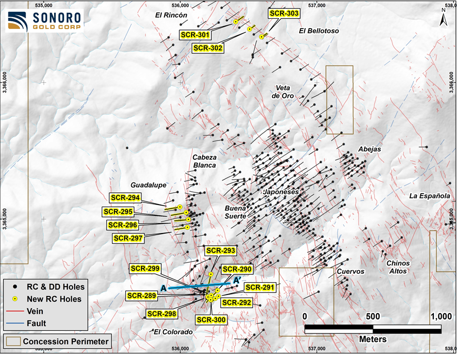 Mel Herdrick, Sonoro’s VP Exploration noted, “With the discovery of multiple prospective high-grade ore-shoots identified by drilling at El Colorado, we are developing an understanding of the permissible extent and trend of these potential ore-shoots that may have up to seven additional repetitions in the footwall of the Guadalupe vein zone extending up to 700 meters to the northwest of El Colorado. These high-grade ore-shoots may add significantly to the existing resource. The process of defining these zones also allows us to refine our understanding of the structural geology and, consequently, identify additional areas for possible material resource expansion and a recalculation of the existing resource.”