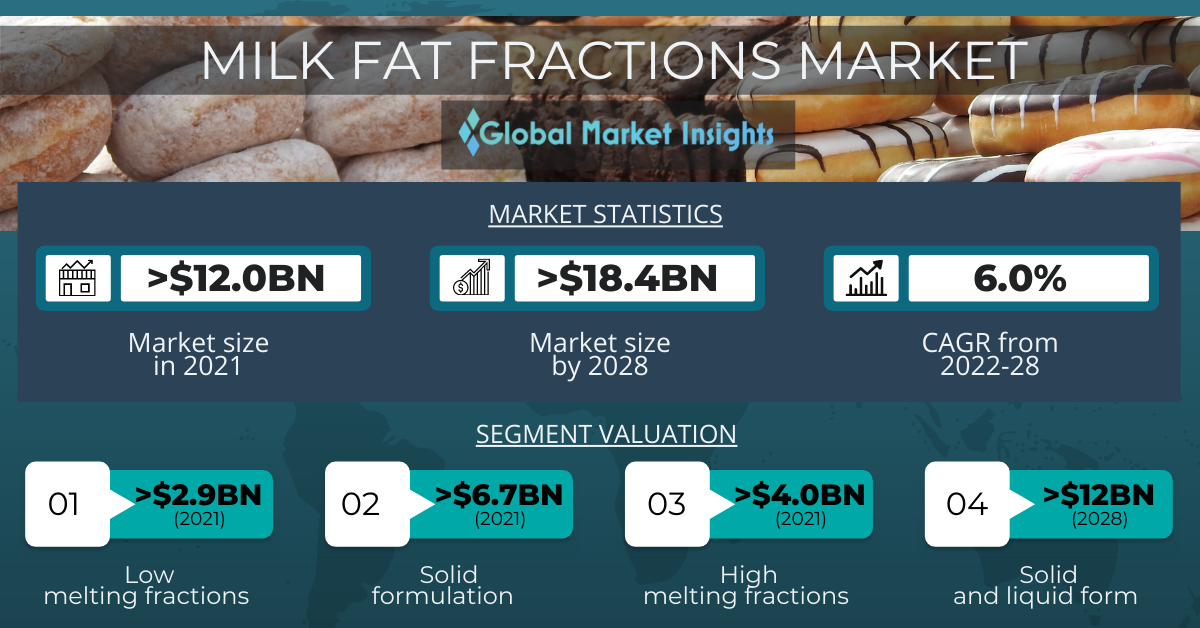 Selbyville, Delaware, May 03, 2022 (GLOBE NEWSWIRE) -- According to the research report by Global Market Insights Inc., the Milk Fat Fractions Market was estimated at USD 12 billion in 2021 and is expected to reach around USD 18.4 billion in revenue by 2028, progressing at a CAGR of 6% from 2022 to 2028. The report gives a comprehensive assessment of top winning strategies, drivers & opportunities, market size & estimations, the competitive scenario, wavering market trends, and major investment pockets.