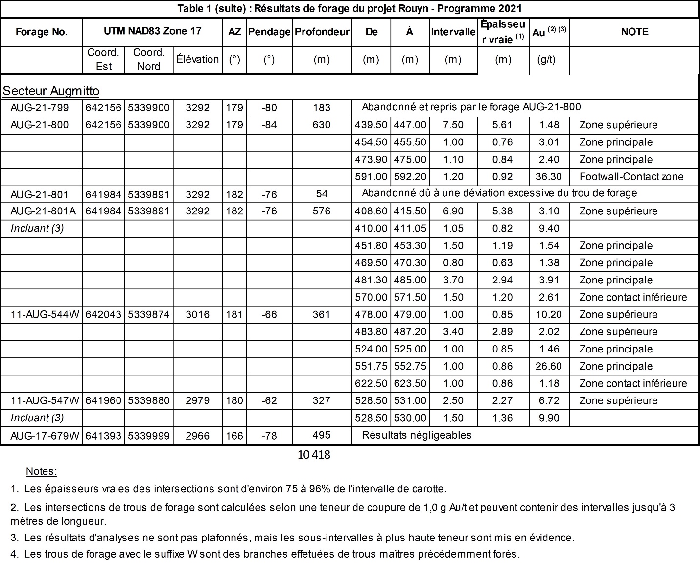 - Forage 11-AUG 544W : 1.0 mètre titrants 26.6 g/t Au dans la zone Main