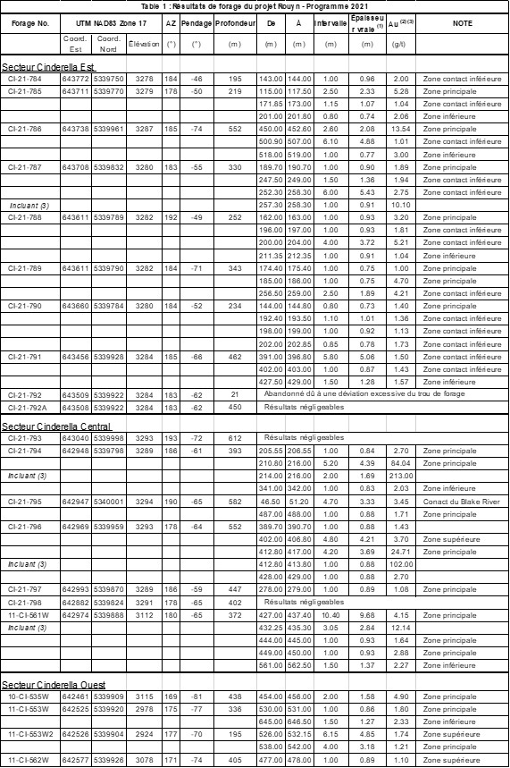 - Forage CI-21-786 : 2.6 mètres titrants 13.54 g/t Au dans la zone Main