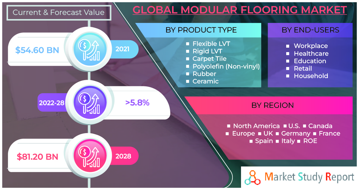 Pune, India, June 13, 2022 (GLOBE NEWSWIRE) -- According to MarketStudyReport, that worldwide modular flooring market share which stood at a valuation of USD 54.60 in 2021, is expected to project a healthy growth rate of 5.8% through 2028 and touch a valuation of USD 81.20 billion by the end of the forecast timeframe.